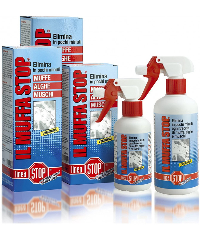 CARATTERISTICHE IL MUFFA STOP è un prodotto che elimina in pochi minuti qualsiasi traccia di muffe, alghe e muschi, presenti in qualsiasi tipo di ambiente. La sua speciale composizione è completata da ipoclorito di sodio che svolge un’azione di denaturazione che combatte lo sviluppo di funghi e muffe in modo estremamente efficace in qualsiasi tipo di ambiente. E’ un prodotto adatto per l’utilizzo anche sulle giunture fra le piastrelle, dove si formano tracce nere dovute alla muffa. IL MUFFA STOP, se diluito (250 ml di prodotto in 5 lt d’acqua) è consigliato per la sanificazione di pavimenti, docce, piscine, sanitari, spogliatoi, etc. E’ un prodotto pronto all’uso.